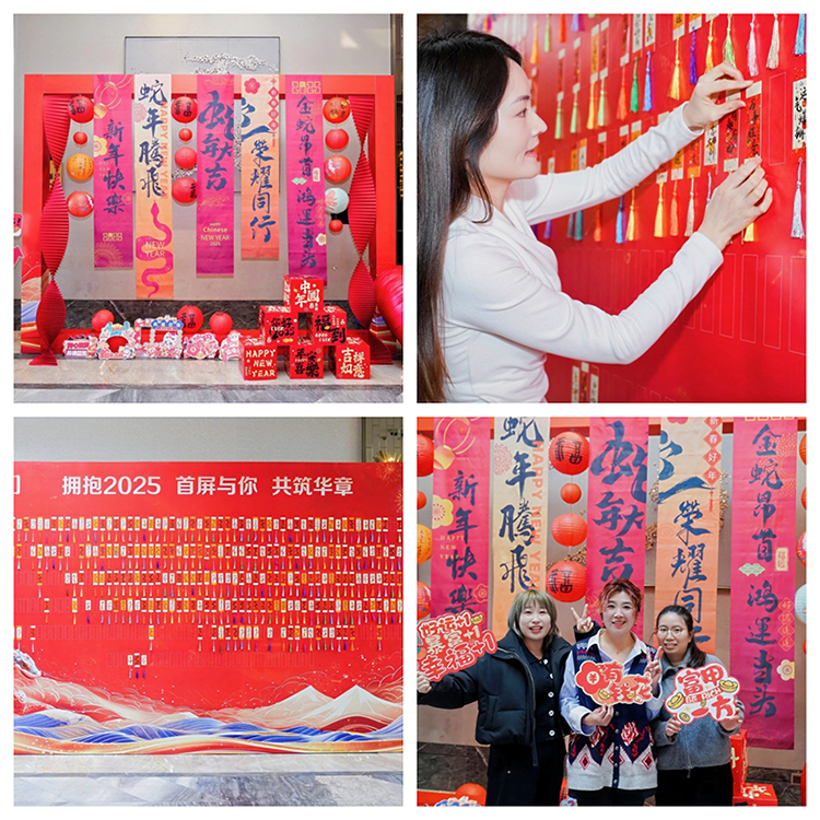 “平安喜樂”、“多財(cái)多億”、“諸事皆宜”等各色國(guó)風(fēng)箋條掛滿簽到墻,大家紛紛寫上祝福語(yǔ),祈愿新年都有好運(yùn)勢(shì)。另一邊,精致的新年打卡區(qū)吸引了伙伴們的目光,擺起Pose來上新年第一拍。
